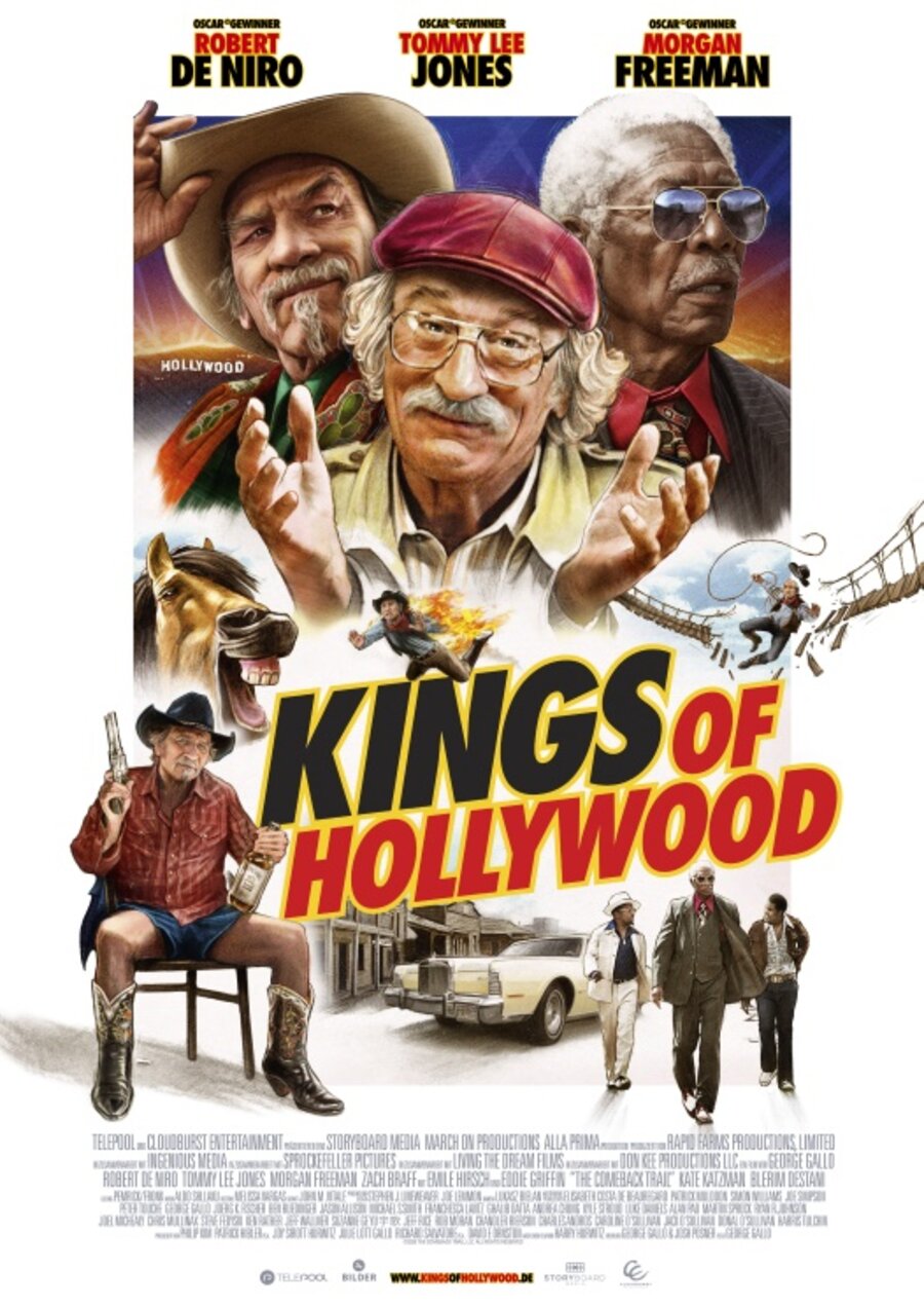 Los Angeles, 1974: Max Barber (Robert DeNiro) ist Hollywood-Produzent mit Leib und Seele. Für seine geliebten Low-Budget-Filme würde der gewiefte Geschäftsführer der Miracle Motion Pictures alles tun. Doch leider lässt der große Erfolg auf sich warten. Als sein letzter Film, den er gemeinsam mit seinem Neffen Walter (Zach Braff) produziert hat, von der katholischen Kirche boykottiert wird, hat er ein Problem: Sein Mafia-Finanzier Reggie Fontaine (Morgan Freeman) will das geliehene Geld zurück und stellt Max ein Ultimatum. Durch einen irrwitzigen Zufall kommt Max die zündende Idee: Beim Dreh seines nächsten Filmes will er den Hauptdarsteller um die Ecke bringen und mit der ausbezahlten Versicherungssumme seine Schulden begleichen. Allerdings hat er nicht damit gerechnet, dass sein Star, der abgehalfterte ehemalige Western-Darsteller Duke Montana (Tommy Lee Jones), einfach nicht totzukriegen ist. Max bringt Duke in immer gewagtere Situationen, doch dieser überlebt einen Stunt nach dem anderen. Und dabei nehmen die Dreharbeiten plötzlich eine Wendung, mit der keiner gerechnet hat…Robert De Niro, Tommy Lee Jones und Morgan Freeman: Regisseur und Drehbuchautor George Gallo versammelt für die wunderbar wilde Komödie KINGS OF HOLLYWOOD (OT: „The Comeback Trail“) drei Leinwandlegenden vor der Kamera und gemeinsam entzünden sie ein Feuerwerk der Screwball-Comedy! Mit seinen Drehbüchern zu Filmklassikern wie „Bad Boys“ und „Midnight Run“ bewies Gallo bereits mehrfach sein Gespür für schräge Situationskomik. Nun schöpft er bei KINGS OF HOLLYWOOD mit einem bestens aufgelegten Ensemble und pointiertem Wortwitz aus dem Vollen. An der Seite der drei Grand Seigneurs spielen Zach Braff („Wish I Was Here“, „Scrubs“) als Max‘ Neffe, Emile Hirsch („Once Upon A Time In Hollywood“) als junger Erfolgsproduzent und Kate Katzman („Walt Before Mickey“) als taffe Regisseurin. KINGS OF HOLLYWOOD – eine heitere Liebeserklärung an die Magie des großen Hollywood-Kinos.